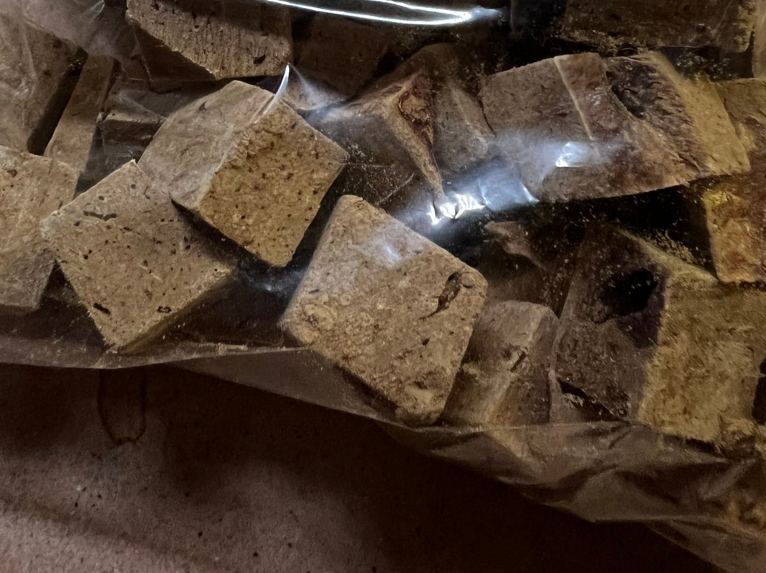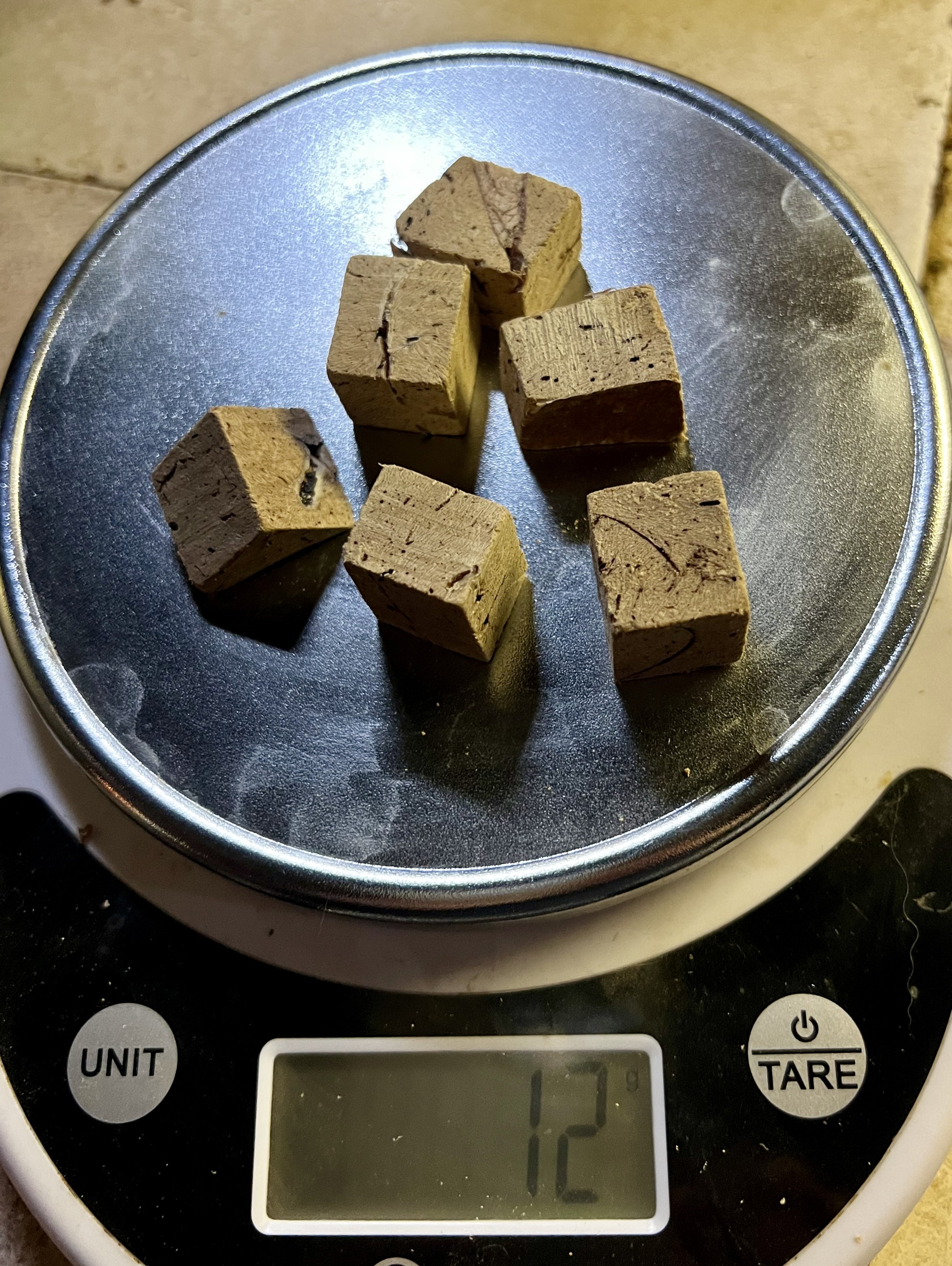 The average weight of a chunk of treat was 2.5 grams across 3 brands.